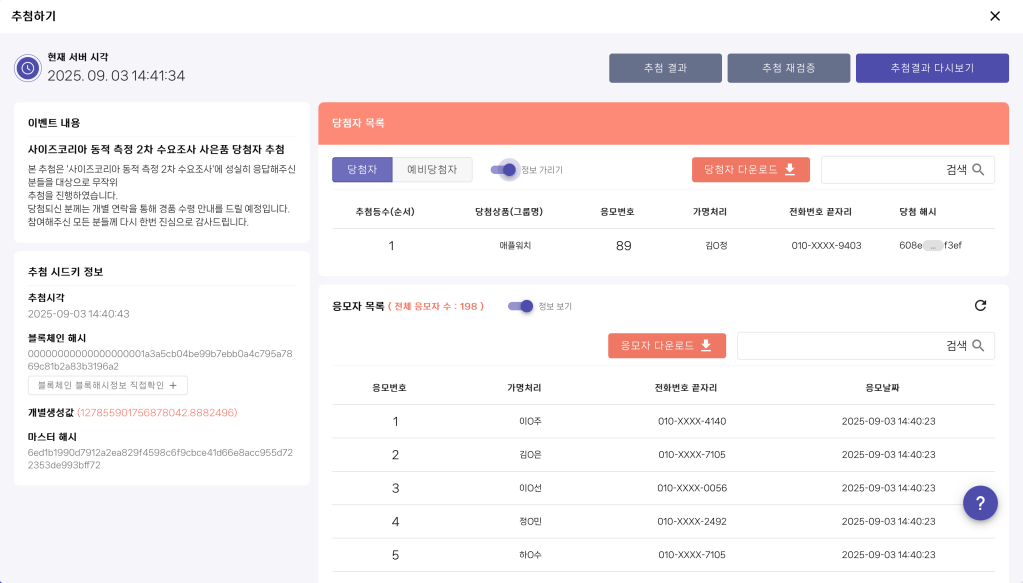 응답을 마무리해주신 분들을 대상으로 공정한 절차를 걸쳐 추첨이 진행되었으며, 매크로 사용이나 중복 참여 등 부적절한 방법으로 설문에 참여하신 경우는 추첨 및 음료쿠폰 지급에서 제외되었음을 알려드립니다. 음료쿠폰은 9월 5일까지 휴대폰 문자로 일괄 발송됩니다. 이벤트 당첨자 선정 절차는 아래 화면에서 확인 가능합니다.