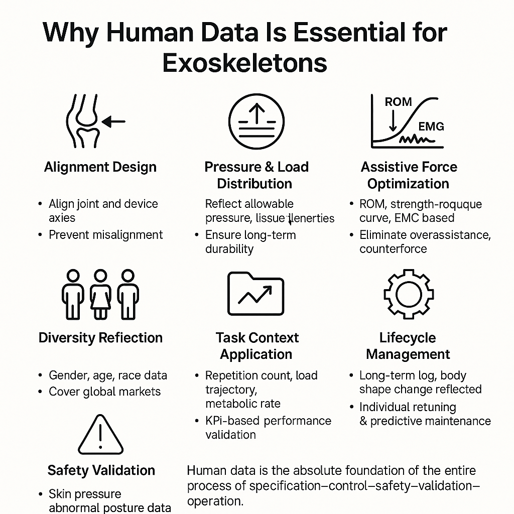 즉, 인체데이터는 규격(맞춤 설계)–제어(정밀 보조)–안전(위험 관리)–검증(성능 입증)–운영(지속 관리) 전 과정의 절대적 기반입니다.