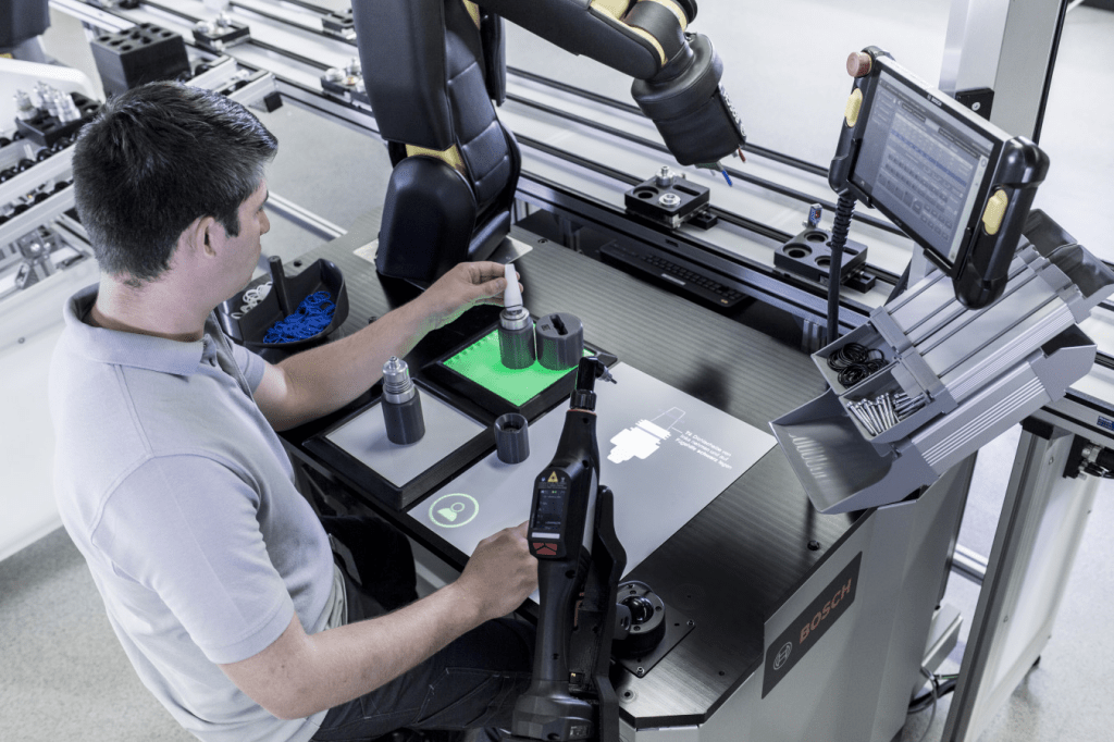ννΈ Boschλ βAPAS(Automatic Production Assistant)βλΌλ νλλ‘λ΄μ ν΅ν΄ μ¬λκ³Ό μΈν리 μμ΄ κ°κΉμ΄ 거리μμ νμ ν μ μλ νκ²½μ ꡬμΆνμ΅λλ€. μ΄ λ‘λ΄μ μμ μμ μμ§μμ μ€μκ°μΌλ‘ κ°μ§νκ³ , μΆ©λ μνμ΄ κ°μ§λλ©΄ μ€μ€λ‘ μλμ κ²½λ‘λ₯Ό μ‘°μ ν©λλ€. μ΄ κ°λ μ Boschμ Workplace 4.0 μ λ΅μ ν΅μ¬μΌλ‘, κ΄λ ¨ λ΄μ©μ Bosch Media β Bosch is turning robots into colleaguesμμ νμΈν μ μμ΅λλ€.