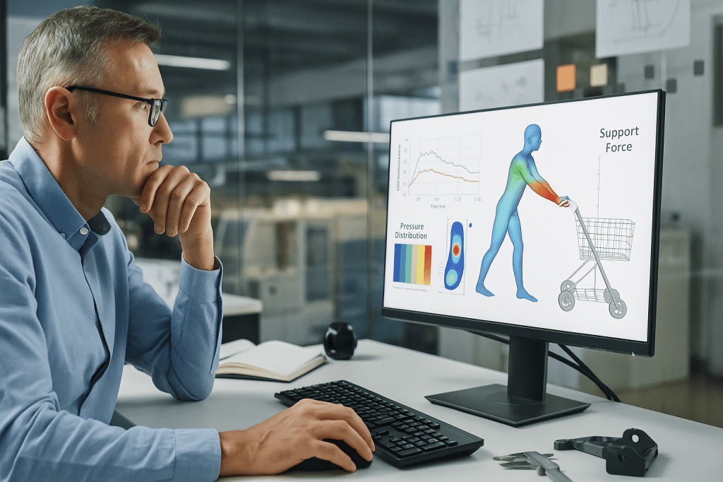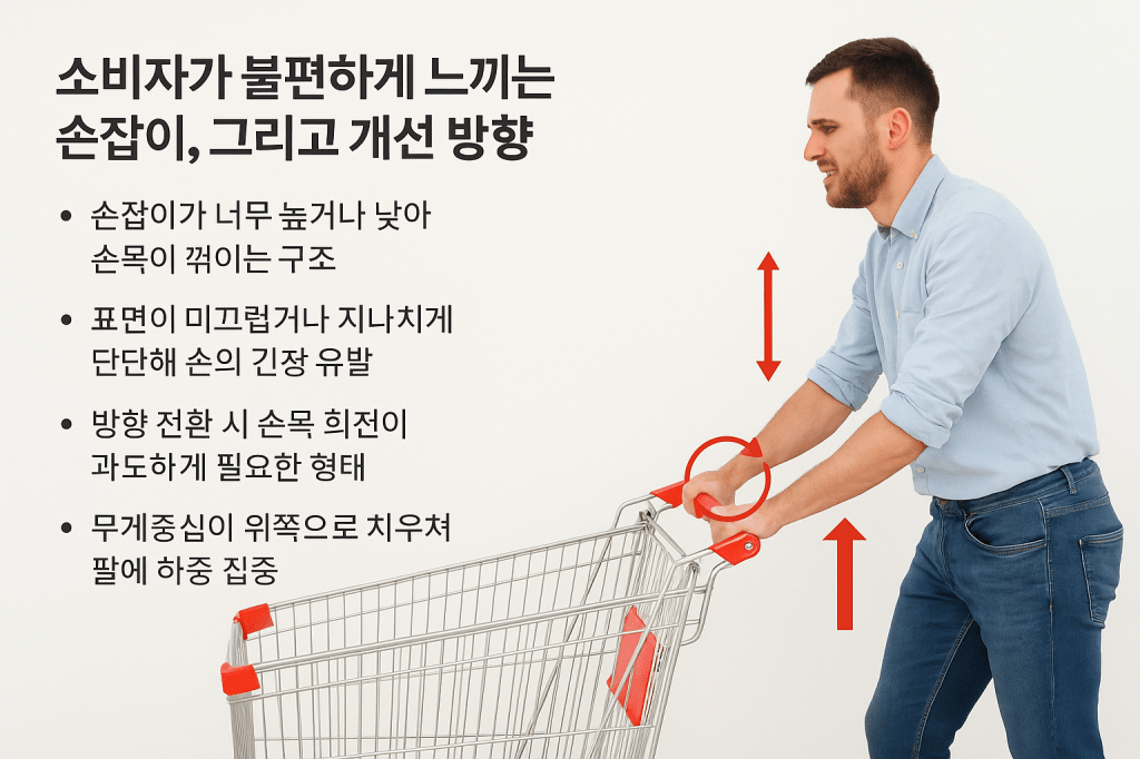 손잡이 디자인이 인체공학적으로 맞지 않을 경우, 사용자의 손목은 비정상적인 각도로 굽혀지거나 비틀리는 동작(radial/ulnar deviation, pronation/supination)을 반복하게 됩니다. 병원용 카트와 의료기기 운반대 연구에서도, 손잡이의 높이와 각도 변화가 손목 관절 각도와 근육 피로에 직접적인 영향을 준다는 결론이 나왔습니다. 이런 반복적이고 비중립(neutral)이 아닌 손목 자세는 근육과 인대에 지속적인 부담을 주며, 결국 손목·팔꿈치·어깨 통증으로 발전하게 됩니다. 따라서 “쇼핑카트 하나 밀었을 뿐인데 왜 손이 아플까?”라는 불만은 결국 제품 설계 단계에서의 구조적 결함으로 설명될 수 있습니다.