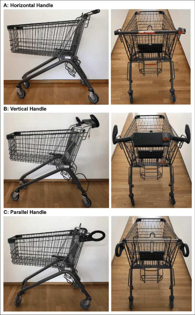 슈퍼마켓이나 대형마트에서 사용하는 일반적인 쇼핑카트의 손잡이는 대부분 가로 형태(horizontal)입니다. 그런데 인체공학 연구에 따르면 이러한 구조가 팔과 손목의 근육을 더 많이 사용하게 만들어, 장시간 이용 시 피로와 통증을 유발할 수 있다는 결과가 있습니다. 예를 들어, 손잡이가 수직(vertical)이나 병렬(parallel) 형태일 때보다 가로형 손잡이를 밀 때 팔의 신전근(extensor muscles)이 더 활발히 작동한다는 연구도 있습니다. 이러한 근육 작용 차이는 단순히 신체 피로의 문제가 아니라, 소비자 행동과 구매 심리에도 영향을 줄 수 있습니다.