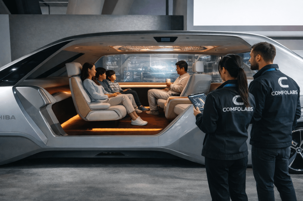 이때 필요한 것이 바로 비정형 착좌 자세 데이터, 시트 회전·슬라이딩 상태의 골반·척추 정렬, 장시간 탑승 시 피로 누적 패턴, 활동 중 상지 도달범위입니다. 특히 기대거나 눕는 자세에서는 체중 분포와 압력 지점이 크게 달라지기 때문에, 기존의 H-point 기반 운전자 모델로는 정확한 설계가 불가능합니다. 자율주행차 내부 설계는 이제 가구, 의료, 웨어러블 설계에 가까운 문제로 확장되고 있습니다.