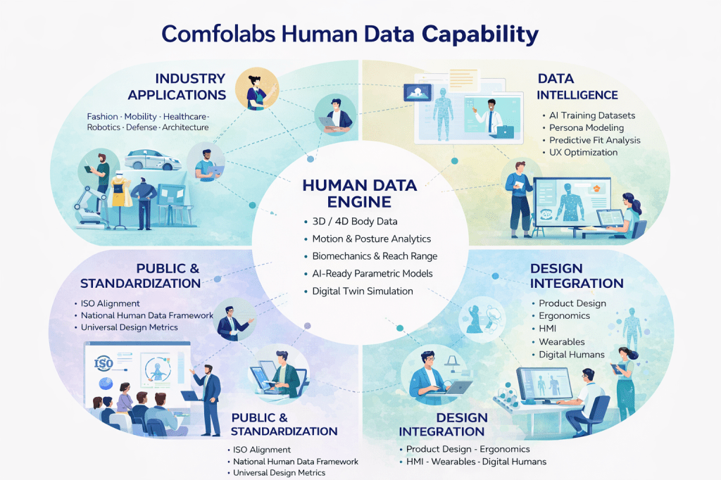 특히 패션, 모빌리티, 가구, 의료, 로봇, 방위산업 등 거의 모든 산업군에서 인체 기반 설계를 요구하고 있으며, 이는 단순한 트렌드가 아닌 구조적 변화입니다. 이제 기업은 “좋은 제품”을 넘어 “사람에게 맞는 제품”을 만들어야 경쟁력을 확보할 수 있습니다. 산업의 질문이 바뀌고 있습니다. 제품 중심에서 사람 중심으로, 그리고 그 핵심에 인체 데이터가 있습니다.