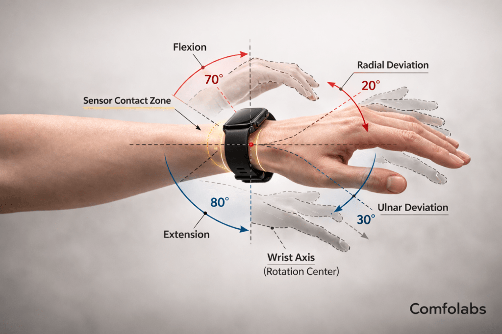 손목은 고정된 구조가 아니라, 굴곡·신전·회내·회외 운동에 따라 지속적으로 변형되는 동적 부위입니다. 운동 중에는 근육 팽창과 혈류 변화로 인해 둘레와 체표 압력이 달라지고, 센서 접촉 조건도 함께 변합니다. 정적 3D 치수 데이터만으로는 실제 사용 환경을 충분히 설명할 수 없는 이유가 여기에 있습니다.