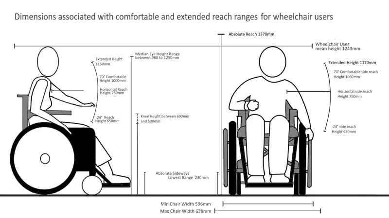 특히 체압 분포는 기존 설계가 놓치고 있는 핵심 변수다. 장시간 좌식 자세로 인해 좌골, 천골, 대퇴 후면에 집중되는 압력은 욕창과 통증, 체형 변형과 직결된다. 그러나 평균 치수 중심 설계는 체표 단면 형상이나 연부조직 변형률을 반영하지 못한다. 도달 범위 역시 단순 팔 길이로 정의될 수 없다. 실제 도달 범위는 어깨 회전각, 몸통 기울기, 전방 체중 이동 가능 범위가 결합된 결과다. 평균 팔 길이 기반 설계는 사용자에게 반복적 부담을 전가하며, 공간에 맞춰 몸을 조정하도록 요구한다. 설계가 평균값에 머무르는 한, 휠체어 사용자는 항상 적응해야 하는 존재로 남게 된다.