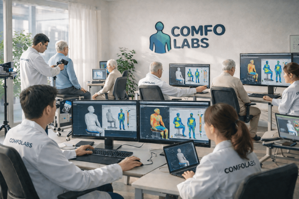 최근 의자 설계 분야에서는 단순한 평균 치수 기반 접근에서 벗어나 인체 데이터 기반 설계(Human Data Driven Design)가 중요한 흐름으로 자리 잡고 있습니다. 특히 3D 인체 스캔, 체압 분포 분석, 착좌 자세 데이터 등 다양한 휴먼 데이터를 활용하면 실제 사용자의 체형과 움직임을 더욱 정확하게 이해할 수 있습니다.
