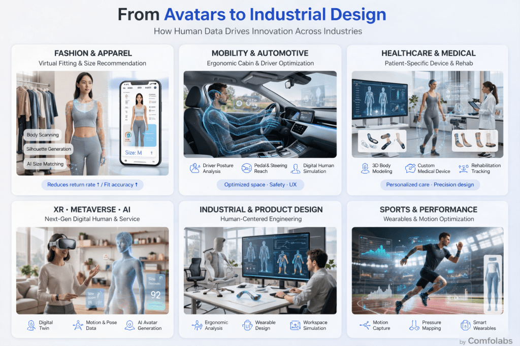 특히 XR, 메타버스, AI 기반 서비스에서는 단순한 그래픽 모델이 아닌 디지털트윈 수준의 인체 모델이 요구됩니다. 이는 정적인 형상뿐 아니라 움직임, 자세 변화, 체형 특성까지 포함하는 고차원 데이터 구조를 필요로 하며, 기업들은 점점 더 정밀한 인체 데이터를 기반으로 제품과 서비스를 설계하고 있습니다.