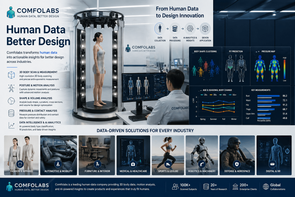 특히 SIZE LAB 플랫폼은 정적인 사이즈 정보가 아닌, 연령별 변화, 시즌별 착용 패턴, 동작 기반 체형 변화를 함께 분석할 수 있는 차세대 설계 플랫폼으로 발전하고 있습니다. 이를 통해 패션·의류 산업은 물론 의료기기, 스포츠웨어, 가구, 모빌리티, XR 디바이스까지 다양한 분야에서 보다 정밀한 사용자 중심 설계가 가능해집니다. 앞으로의 경쟁력은 얼마나 많은 데이터를 보유했는가가 아니라, 얼마나 정확하게 인간의 변화를 이해하고 설계에 반영할 수 있는가에 달려 있으며, 컴포랩스는 그 중심에서 휴먼데이터 기반의 새로운 설계 기준을 만들어가고 있습니다.
