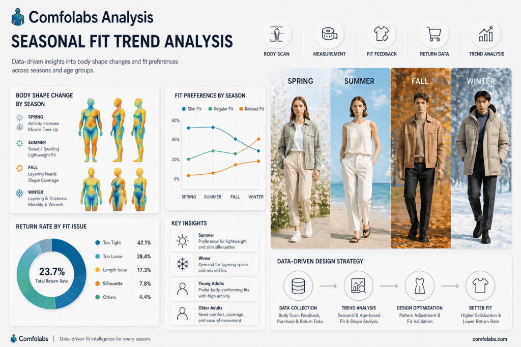 예를 들어 여름철에는 활동량 증가와 체형 노출에 따라 슬림핏 선호가 높아지지만, 동시에 체표 부종과 착용 압박 민감도가 증가합니다. 반대로 겨울철에는 레이어드 착용과 실내 활동 증가로 인해 여유량 설계와 움직임 보장이 더욱 중요해집니다. 최근에는 반품 데이터와 실제 구매 후 피드백을 함께 분석하여 시즌별 핏 실패 원인을 역추적하는 방식도 확대되고 있습니다. 특히 글로벌 시장에서는 국가별 체형 차이와 연령 구조 차이까지 고려해야 하며, 앞으로의 브랜드 경쟁력은 얼마나 빠르게 체형 변화 데이터를 제품 전략으로 전환할 수 있는가에 달려 있습니다.