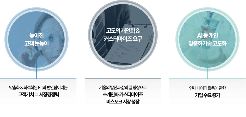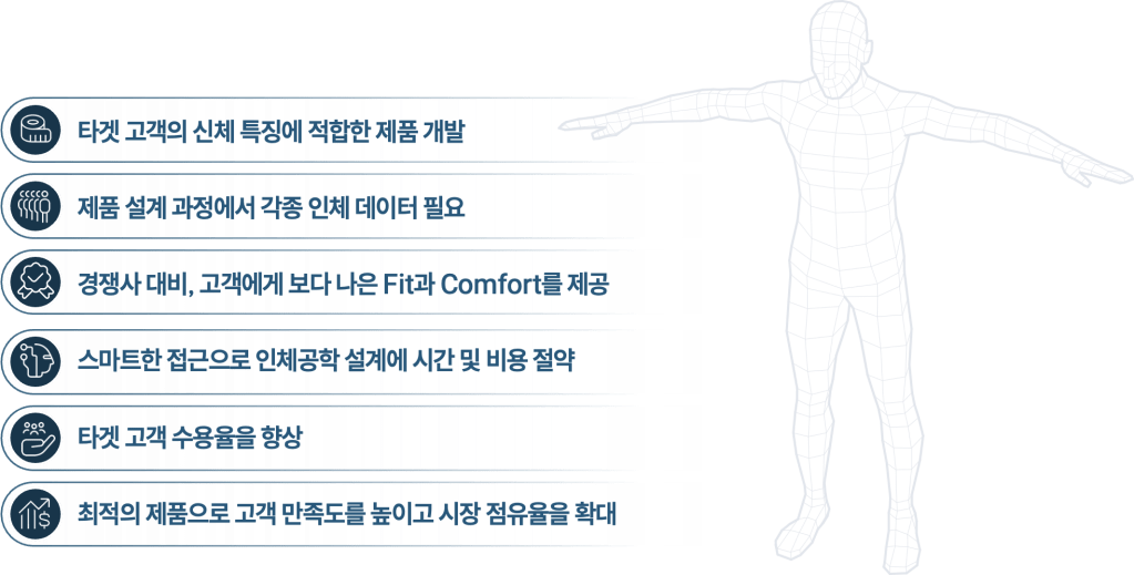기술과 시장이 발전하고 고객들의 눈높이가 높아질수록 사용자들은 더욱 고도화된 개인 맞춤형 제품을 요구합니다. Fit과 Comfort라는 고객가치가 곧 시장경쟁력이 되므로 더 많은 기업들이 인체데이터를 요구하고 있습니다.