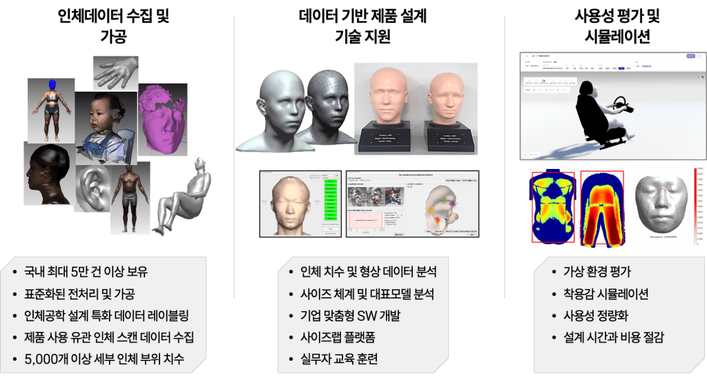 사이즈랩 플랫폼(sizelab.io)은 3차원 인체 스캔 데이터를 활용하여 다양한 인체공학적 설계 솔루션을 제공하는 B2B 온라인 서비스입니다. 100,000건 이상의 정밀 가공된 국내외 3차원 인체의 형상 데이터를 기반으로, 다양한 제품의 에르고디자인에 필수적인 인체 치수와 3차원 형상 정보를 제공합니다.